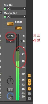 위 그림은 에이블톤의 세션 뷰에 있는 믹서의 마스터 단자입니다. 마스터 단자에 전체 트랙들의 소리가 모입니다. 일단 결론부터 말하자면 마스터 단자의 헤드룸을 평균 -6db 정도로 남겨 주시는 것이 좋습니다. 헤드룸이란 0db 기준 피크 레벨(시그널의 가장 상단) 위에 있는 여백 공간입니다.